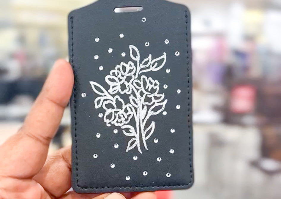This technique is perfect for elevating luggage tags, leather notebooks, eyeglass cases, satin ribbons, satin bows, suede items, faux leather items and more